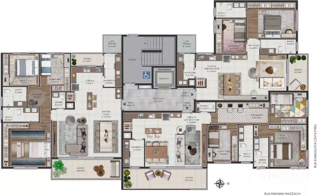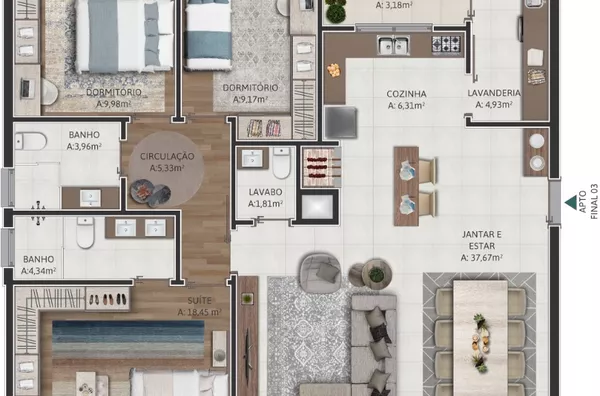 Apartamento 3 dormitórios sendo 1 suíte, living com ambientes integrados e churrasqueira na cozinha, lavanderia ampla e independente, medidores de água e gás individuais, isolamento acústico de pisos com manta, posição solar Leste/Oeste, 2 vagas de garagem, opção 3 vagas, acabamento de alto padrão