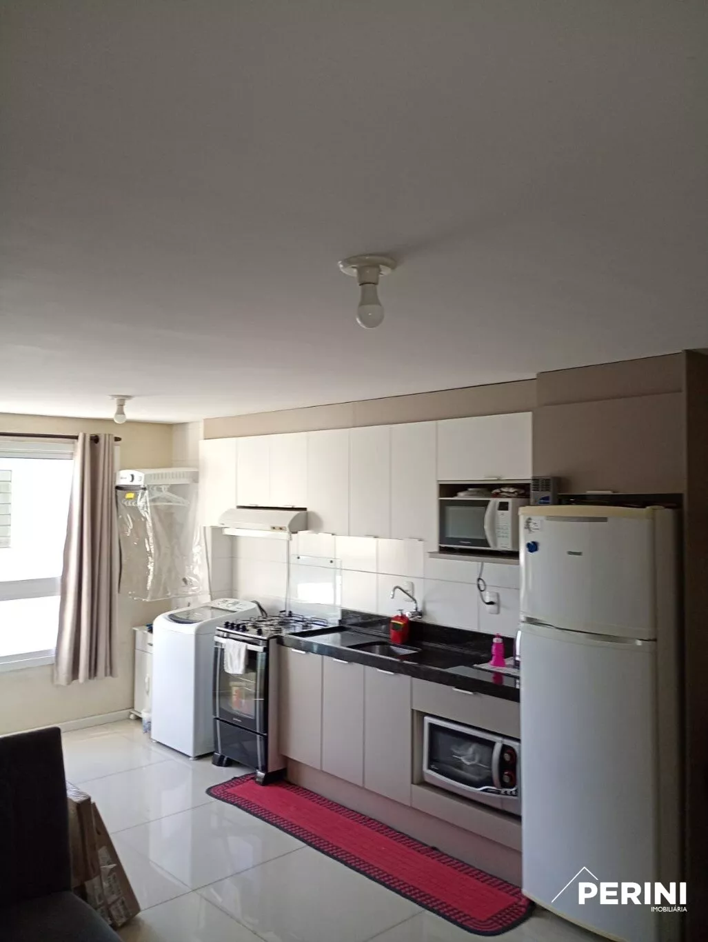 Apartamento 2 dormitórios, sala, cozinha conjugada, 1 banheiro, área de serviço, 1 vaga de garagem, ficam os móveis fixos da cozinha e do banheiro.
